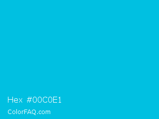 Hex #00c0e1 Color is a normal cyan color and the nearest color is Cyan Process #00b7eb. Hex code #00c0e1 and RGB value is rgb(0,192,225). In RGB color space, this color is composed of 0% red, 75% green, 88% blue, In CMYK color space, this color is composed of 100% cyan, 15% magenta, 0% yellow , 12% black , In HSL color space, this color has a hue angle of 189° , 100% saturation and 44% lightness.
