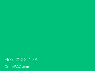 Hex #00c17a Color is a normal green color and the nearest color is Green Munsell #00a877. Hex code #00c17a and RGB value is rgb(0,193,122). In RGB color space, this color is composed of 0% red, 76% green, 48% blue, In CMYK color space, this color is composed of 100% cyan, 0% magenta, 37% yellow , 24% black , In HSL color space, this color has a hue angle of 158° , 100% saturation and 38% lightness.