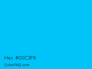 Hex #00c3f8 Color is a normal cyan color and the nearest color is Deep Sky Blue #00bfff. Hex code #00c3f8 and RGB value is rgb(0,195,248). In RGB color space, this color is composed of 0% red, 76% green, 97% blue, In CMYK color space, this color is composed of 100% cyan, 21% magenta, 0% yellow , 3% black , In HSL color space, this color has a hue angle of 193° , 100% saturation and 49% lightness.