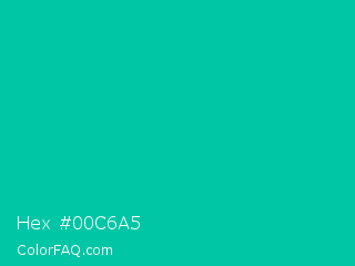 Hex #00c6a5 Color is a normal cyan color and the nearest color is Amazonite #00c4b0. Hex code #00c6a5 and RGB value is rgb(0,198,165). In RGB color space, this color is composed of 0% red, 78% green, 65% blue, In CMYK color space, this color is composed of 100% cyan, 0% magenta, 17% yellow , 22% black , In HSL color space, this color has a hue angle of 170° , 100% saturation and 39% lightness.