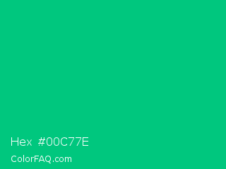 Hex #00c77e Color is a normal green color and the nearest color is Caribbean Green #00cc99. Hex code #00c77e and RGB value is rgb(0,199,126). In RGB color space, this color is composed of 0% red, 78% green, 49% blue, In CMYK color space, this color is composed of 100% cyan, 0% magenta, 37% yellow , 22% black , In HSL color space, this color has a hue angle of 158° , 100% saturation and 39% lightness.