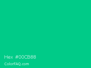 Hex #00cb88 Color is a normal green color and the nearest color is Caribbean Green #00cc99. Hex code #00cb88 and RGB value is rgb(0,203,136). In RGB color space, this color is composed of 0% red, 80% green, 53% blue, In CMYK color space, this color is composed of 100% cyan, 0% magenta, 33% yellow , 20% black , In HSL color space, this color has a hue angle of 160° , 100% saturation and 40% lightness.