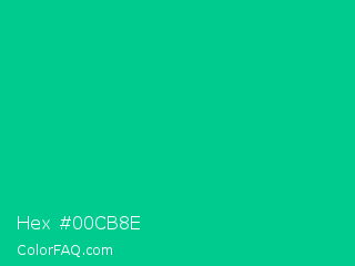 Hex #00cb8e Color is a normal green color and the nearest color is Caribbean Green #00cc99. Hex code #00cb8e and RGB value is rgb(0,203,142). In RGB color space, this color is composed of 0% red, 80% green, 56% blue, In CMYK color space, this color is composed of 100% cyan, 0% magenta, 30% yellow , 20% black , In HSL color space, this color has a hue angle of 162° , 100% saturation and 40% lightness.