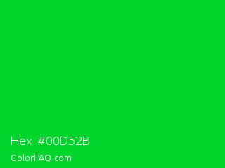 Hex #00d52b Color is a normal green color and the nearest color is Vivid Malachite #00cc33. Hex code #00d52b and RGB value is rgb(0,213,43). In RGB color space, this color is composed of 0% red, 84% green, 17% blue, In CMYK color space, this color is composed of 100% cyan, 0% magenta, 80% yellow , 16% black , In HSL color space, this color has a hue angle of 132° , 100% saturation and 42% lightness.