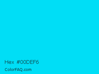 Hex #00def6 Color is a normal cyan color and the nearest color is Vivid Sky Blue #00ccff. Hex code #00def6 and RGB value is rgb(0,222,246). In RGB color space, this color is composed of 0% red, 87% green, 96% blue, In CMYK color space, this color is composed of 100% cyan, 10% magenta, 0% yellow , 4% black , In HSL color space, this color has a hue angle of 186° , 100% saturation and 48% lightness.