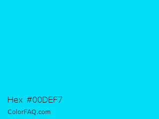 Hex #00def7 Color is a normal cyan color and the nearest color is Vivid Sky Blue #00ccff. Hex code #00def7 and RGB value is rgb(0,222,247). In RGB color space, this color is composed of 0% red, 87% green, 97% blue, In CMYK color space, this color is composed of 100% cyan, 10% magenta, 0% yellow , 3% black , In HSL color space, this color has a hue angle of 186° , 100% saturation and 48% lightness.
