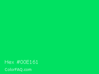 Hex #00e161 Color is a normal green color and the nearest color is Malachite #0bda51. Hex code #00e161 and RGB value is rgb(0,225,97). In RGB color space, this color is composed of 0% red, 88% green, 38% blue, In CMYK color space, this color is composed of 100% cyan, 0% magenta, 57% yellow , 12% black , In HSL color space, this color has a hue angle of 146° , 100% saturation and 44% lightness.