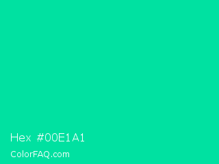 Hex #00e1a1 Color is a normal green color and the nearest color is Caribbean Green #00cc99. Hex code #00e1a1 and RGB value is rgb(0,225,161). In RGB color space, this color is composed of 0% red, 88% green, 63% blue, In CMYK color space, this color is composed of 100% cyan, 0% magenta, 28% yellow , 12% black , In HSL color space, this color has a hue angle of 163° , 100% saturation and 44% lightness.