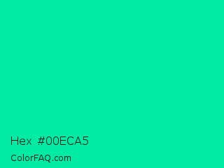 Hex #00eca5 Color is a normal green color and the nearest color is Medium Spring Green #00fa9a. Hex code #00eca5 and RGB value is rgb(0,236,165). In RGB color space, this color is composed of 0% red, 93% green, 65% blue, In CMYK color space, this color is composed of 100% cyan, 0% magenta, 30% yellow , 7% black , In HSL color space, this color has a hue angle of 162° , 100% saturation and 46% lightness.