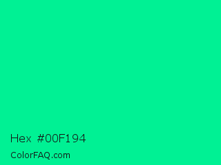Hex #00f194 Color is a normal green color and the nearest color is Medium Spring Green #00fa9a. Hex code #00f194 and RGB value is rgb(0,241,148). In RGB color space, this color is composed of 0% red, 95% green, 58% blue, In CMYK color space, this color is composed of 100% cyan, 0% magenta, 39% yellow , 5% black , In HSL color space, this color has a hue angle of 157° , 100% saturation and 47% lightness.