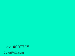 Hex #00f7c5 Color is a normal cyan color and the nearest color is Bright Turquoise #08e8de. Hex code #00f7c5 and RGB value is rgb(0,247,197). In RGB color space, this color is composed of 0% red, 97% green, 77% blue, In CMYK color space, this color is composed of 100% cyan, 0% magenta, 20% yellow , 3% black , In HSL color space, this color has a hue angle of 168° , 100% saturation and 48% lightness.
