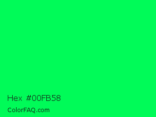 Hex #00fb58 Color is a normal green color and the nearest color is Malachite #0bda51. Hex code #00fb58 and RGB value is rgb(0,251,88). In RGB color space, this color is composed of 0% red, 98% green, 35% blue, In CMYK color space, this color is composed of 100% cyan, 0% magenta, 65% yellow , 2% black , In HSL color space, this color has a hue angle of 141° , 100% saturation and 49% lightness.