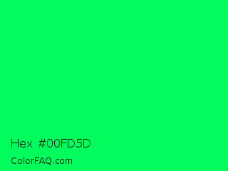 Hex #00fd5d Color is a normal green color and the nearest color is Spring Green #00ff7f. Hex code #00fd5d and RGB value is rgb(0,253,93). In RGB color space, this color is composed of 0% red, 99% green, 36% blue, In CMYK color space, this color is composed of 100% cyan, 0% magenta, 63% yellow , 1% black , In HSL color space, this color has a hue angle of 142° , 100% saturation and 50% lightness.