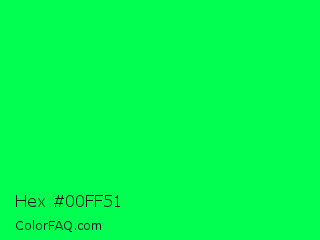 Hex #00ff51 Color is a normal green color and the nearest color is Malachite #0bda51. Hex code #00ff51 and RGB value is rgb(0,255,81). In RGB color space, this color is composed of 0% red, 100% green, 32% blue, In CMYK color space, this color is composed of 100% cyan, 0% magenta, 68% yellow , 0% black , In HSL color space, this color has a hue angle of 139° , 100% saturation and 50% lightness.