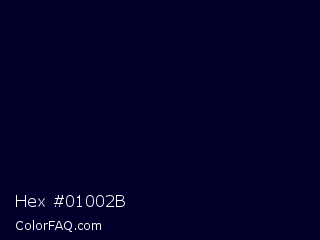 Hex #01002b Color is a almost black indigo color and the nearest color is Black Rock #0d0332. Hex code #01002b and RGB value is rgb(1,0,43). In RGB color space, this color is composed of 0% red, 0% green, 17% blue, In CMYK color space, this color is composed of 98% cyan, 100% magenta, 0% yellow , 83% black , In HSL color space, this color has a hue angle of 241° , 100% saturation and 8% lightness.