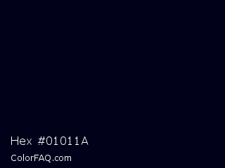 Hex #01011a Color is a almost black blue color and the nearest color is Black Russian #0a001c. Hex code #01011a and RGB value is rgb(1,1,26). In RGB color space, this color is composed of 0% red, 0% green, 10% blue, In CMYK color space, this color is composed of 96% cyan, 96% magenta, 0% yellow , 90% black , In HSL color space, this color has a hue angle of 240° , 93% saturation and 5% lightness.