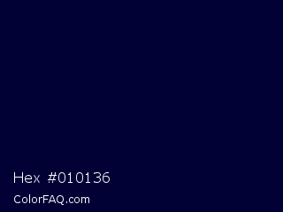 Hex #010136 Color is a very dark blue color and the nearest color is Stratos #000741. Hex code #010136 and RGB value is rgb(1,1,54). In RGB color space, this color is composed of 0% red, 0% green, 21% blue, In CMYK color space, this color is composed of 98% cyan, 98% magenta, 0% yellow , 79% black , In HSL color space, this color has a hue angle of 240° , 96% saturation and 11% lightness.