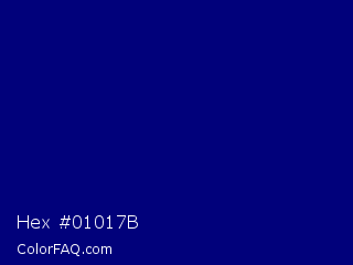 Hex #01017b Color is a dark blue color and the nearest color is Navy Blue #000080. Hex code #01017b and RGB value is rgb(1,1,123). In RGB color space, this color is composed of 0% red, 0% green, 48% blue, In CMYK color space, this color is composed of 99% cyan, 99% magenta, 0% yellow , 52% black , In HSL color space, this color has a hue angle of 240° , 98% saturation and 24% lightness.