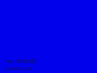 Hex #0101ec Color is a normal blue color and the nearest color is Blue #0000ff. Hex code #0101ec and RGB value is rgb(1,1,236). In RGB color space, this color is composed of 0% red, 0% green, 93% blue, In CMYK color space, this color is composed of 100% cyan, 100% magenta, 0% yellow , 7% black , In HSL color space, this color has a hue angle of 240° , 99% saturation and 46% lightness.