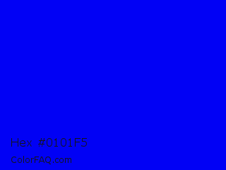 Hex #0101f5 Color is a normal blue color and the nearest color is Blue #0000ff. Hex code #0101f5 and RGB value is rgb(1,1,245). In RGB color space, this color is composed of 0% red, 0% green, 96% blue, In CMYK color space, this color is composed of 100% cyan, 100% magenta, 0% yellow , 4% black , In HSL color space, this color has a hue angle of 240° , 99% saturation and 48% lightness.