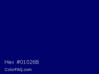 Hex #01026b Color is a very dark blue color and the nearest color is Arapawa #110c6c. Hex code #01026b and RGB value is rgb(1,2,107). In RGB color space, this color is composed of 0% red, 1% green, 42% blue, In CMYK color space, this color is composed of 99% cyan, 98% magenta, 0% yellow , 58% black , In HSL color space, this color has a hue angle of 239° , 98% saturation and 21% lightness.
