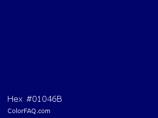 Hex #01046b Color is a very dark blue color and the nearest color is Arapawa #110c6c. Hex code #01046b and RGB value is rgb(1,4,107). In RGB color space, this color is composed of 0% red, 2% green, 42% blue, In CMYK color space, this color is composed of 99% cyan, 96% magenta, 0% yellow , 58% black , In HSL color space, this color has a hue angle of 238° , 98% saturation and 21% lightness.