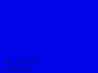 Hex #0105e8 Color is a normal blue color and the nearest color is Blue #0000ff. Hex code #0105e8 and RGB value is rgb(1,5,232). In RGB color space, this color is composed of 0% red, 2% green, 91% blue, In CMYK color space, this color is composed of 100% cyan, 98% magenta, 0% yellow , 9% black , In HSL color space, this color has a hue angle of 239° , 99% saturation and 46% lightness.