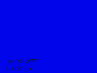 Hex #0105ea Color is a normal blue color and the nearest color is Blue #0000ff. Hex code #0105ea and RGB value is rgb(1,5,234). In RGB color space, this color is composed of 0% red, 2% green, 92% blue, In CMYK color space, this color is composed of 100% cyan, 98% magenta, 0% yellow , 8% black , In HSL color space, this color has a hue angle of 239° , 99% saturation and 46% lightness.