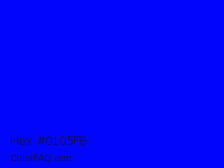 Hex #0105fb Color is a normal blue color and the nearest color is Blue #0000ff. Hex code #0105fb and RGB value is rgb(1,5,251). In RGB color space, this color is composed of 0% red, 2% green, 98% blue, In CMYK color space, this color is composed of 100% cyan, 98% magenta, 0% yellow , 2% black , In HSL color space, this color has a hue angle of 239° , 99% saturation and 49% lightness.