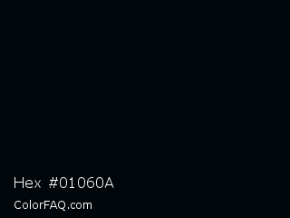 Hex #01060a Color is a almost black blue color and the nearest color is Rich Black FOGRA39 #010203. Hex code #01060a and RGB value is rgb(1,6,10). In RGB color space, this color is composed of 0% red, 2% green, 4% blue, In CMYK color space, this color is composed of 90% cyan, 40% magenta, 0% yellow , 96% black , In HSL color space, this color has a hue angle of 207° , 82% saturation and 2% lightness.