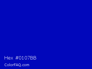 Hex #0107bb Color is a normal blue color and the nearest color is Dark Blue #0000c8. Hex code #0107bb and RGB value is rgb(1,7,187). In RGB color space, this color is composed of 0% red, 3% green, 73% blue, In CMYK color space, this color is composed of 99% cyan, 96% magenta, 0% yellow , 27% black , In HSL color space, this color has a hue angle of 238° , 99% saturation and 37% lightness.