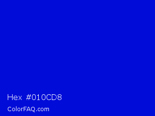 Hex #010cd8 Color is a normal blue color and the nearest color is Medium Blue #0000cd. Hex code #010cd8 and RGB value is rgb(1,12,216). In RGB color space, this color is composed of 0% red, 5% green, 85% blue, In CMYK color space, this color is composed of 100% cyan, 94% magenta, 0% yellow , 15% black , In HSL color space, this color has a hue angle of 237° , 99% saturation and 43% lightness.