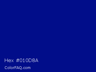 Hex #010d8a Color is a dark blue color and the nearest color is Phthalo Blue #000f89. Hex code #010d8a and RGB value is rgb(1,13,138). In RGB color space, this color is composed of 0% red, 5% green, 54% blue, In CMYK color space, this color is composed of 99% cyan, 91% magenta, 0% yellow , 46% black , In HSL color space, this color has a hue angle of 235° , 99% saturation and 27% lightness.