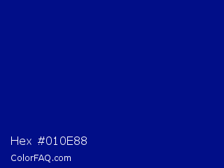 Hex #010e88 Color is a dark blue color and the nearest color is Phthalo Blue #000f89. Hex code #010e88 and RGB value is rgb(1,14,136). In RGB color space, this color is composed of 0% red, 5% green, 53% blue, In CMYK color space, this color is composed of 99% cyan, 90% magenta, 0% yellow , 47% black , In HSL color space, this color has a hue angle of 234° , 99% saturation and 27% lightness.