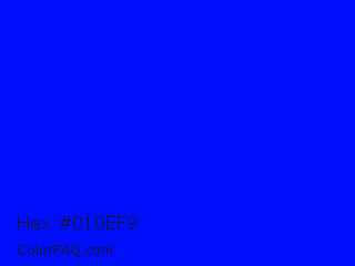 Hex #010ef9 Color is a normal blue color and the nearest color is Blue #0000ff. Hex code #010ef9 and RGB value is rgb(1,14,249). In RGB color space, this color is composed of 0% red, 5% green, 98% blue, In CMYK color space, this color is composed of 100% cyan, 94% magenta, 0% yellow , 2% black , In HSL color space, this color has a hue angle of 237° , 99% saturation and 49% lightness.