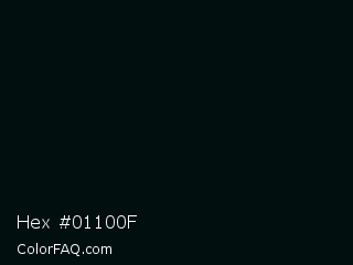 Hex #01100f Color is a almost black cyan color and the nearest color is Rich Black FOGRA29 #010b13. Hex code #01100f and RGB value is rgb(1,16,15). In RGB color space, this color is composed of 0% red, 6% green, 6% blue, In CMYK color space, this color is composed of 94% cyan, 0% magenta, 6% yellow , 94% black , In HSL color space, this color has a hue angle of 176° , 88% saturation and 3% lightness.