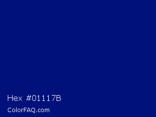 Hex #01117b Color is a dark blue color and the nearest color is Dark Imperial Blue #00147e. Hex code #01117b and RGB value is rgb(1,17,123). In RGB color space, this color is composed of 0% red, 7% green, 48% blue, In CMYK color space, this color is composed of 99% cyan, 86% magenta, 0% yellow , 52% black , In HSL color space, this color has a hue angle of 232° , 98% saturation and 24% lightness.