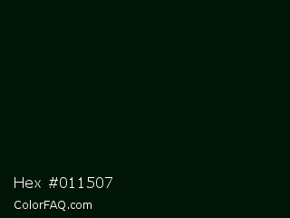 Hex #011507 Color is a almost black green color and the nearest color is Midnight Moss #041004. Hex code #011507 and RGB value is rgb(1,21,7). In RGB color space, this color is composed of 0% red, 8% green, 3% blue, In CMYK color space, this color is composed of 95% cyan, 0% magenta, 67% yellow , 92% black , In HSL color space, this color has a hue angle of 138° , 91% saturation and 4% lightness.