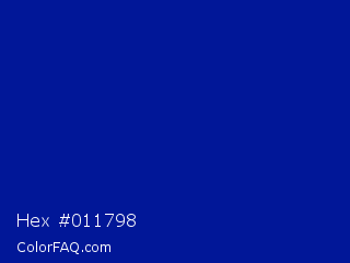 Hex #011798 Color is a dark blue color and the nearest color is Imperial Blue #002395. Hex code #011798 and RGB value is rgb(1,23,152). In RGB color space, this color is composed of 0% red, 9% green, 60% blue, In CMYK color space, this color is composed of 99% cyan, 85% magenta, 0% yellow , 40% black , In HSL color space, this color has a hue angle of 231° , 99% saturation and 30% lightness.