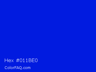 Hex #011be0 Color is a normal blue color and the nearest color is Bluebonnet #1c1cf0. Hex code #011be0 and RGB value is rgb(1,27,224). In RGB color space, this color is composed of 0% red, 11% green, 88% blue, In CMYK color space, this color is composed of 100% cyan, 88% magenta, 0% yellow , 12% black , In HSL color space, this color has a hue angle of 233° , 99% saturation and 44% lightness.