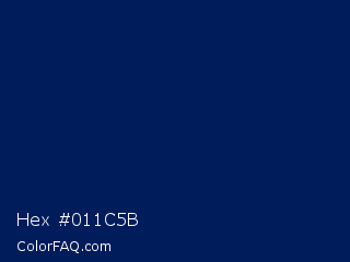 Hex #011c5b Color is a very dark blue color and the nearest color is Gulf Blue #051657. Hex code #011c5b and RGB value is rgb(1,28,91). In RGB color space, this color is composed of 0% red, 11% green, 36% blue, In CMYK color space, this color is composed of 99% cyan, 69% magenta, 0% yellow , 64% black , In HSL color space, this color has a hue angle of 222° , 98% saturation and 18% lightness.