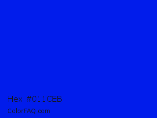 Hex #011ceb Color is a normal blue color and the nearest color is Bluebonnet #1c1cf0. Hex code #011ceb and RGB value is rgb(1,28,235). In RGB color space, this color is composed of 0% red, 11% green, 92% blue, In CMYK color space, this color is composed of 100% cyan, 88% magenta, 0% yellow , 8% black , In HSL color space, this color has a hue angle of 233° , 99% saturation and 46% lightness.