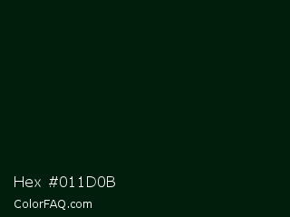 Hex #011d0b Color is a almost black green color and the nearest color is Holly #011d13. Hex code #011d0b and RGB value is rgb(1,29,11). In RGB color space, this color is composed of 0% red, 11% green, 4% blue, In CMYK color space, this color is composed of 97% cyan, 0% magenta, 62% yellow , 89% black , In HSL color space, this color has a hue angle of 141° , 93% saturation and 6% lightness.