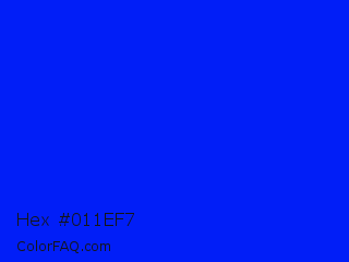 Hex #011ef7 Color is a normal blue color and the nearest color is Bluebonnet #1c1cf0. Hex code #011ef7 and RGB value is rgb(1,30,247). In RGB color space, this color is composed of 0% red, 12% green, 97% blue, In CMYK color space, this color is composed of 100% cyan, 88% magenta, 0% yellow , 3% black , In HSL color space, this color has a hue angle of 233° , 99% saturation and 49% lightness.