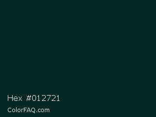 Hex #012721 Color is a almost black cyan color and the nearest color is Burnham #002e20. Hex code #012721 and RGB value is rgb(1,39,33). In RGB color space, this color is composed of 0% red, 15% green, 13% blue, In CMYK color space, this color is composed of 97% cyan, 0% magenta, 15% yellow , 85% black , In HSL color space, this color has a hue angle of 171° , 95% saturation and 8% lightness.
