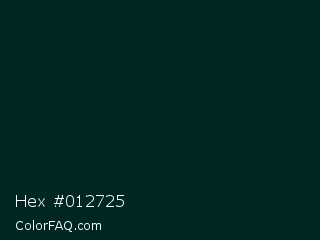 Hex #012725 Color is a almost black cyan color and the nearest color is Burnham #002e20. Hex code #012725 and RGB value is rgb(1,39,37). In RGB color space, this color is composed of 0% red, 15% green, 15% blue, In CMYK color space, this color is composed of 97% cyan, 0% magenta, 5% yellow , 85% black , In HSL color space, this color has a hue angle of 177° , 95% saturation and 8% lightness.