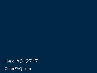 Hex #012747 Color is a very dark blue color and the nearest color is Oxford Blue #002147. Hex code #012747 and RGB value is rgb(1,39,71). In RGB color space, this color is composed of 0% red, 15% green, 28% blue, In CMYK color space, this color is composed of 99% cyan, 45% magenta, 0% yellow , 72% black , In HSL color space, this color has a hue angle of 207° , 97% saturation and 14% lightness.