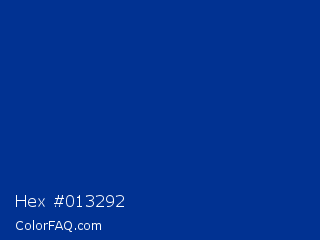 Hex #013292 Color is a dark blue color and the nearest color is Air Force Blue USAF #00308f. Hex code #013292 and RGB value is rgb(1,50,146). In RGB color space, this color is composed of 0% red, 20% green, 57% blue, In CMYK color space, this color is composed of 99% cyan, 66% magenta, 0% yellow , 43% black , In HSL color space, this color has a hue angle of 220° , 99% saturation and 29% lightness.