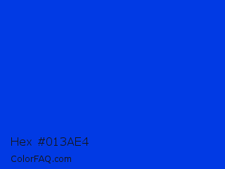 Hex #013ae4 Color is a normal blue color and the nearest color is Blue RYB #0247fe. Hex code #013ae4 and RGB value is rgb(1,58,228). In RGB color space, this color is composed of 0% red, 23% green, 89% blue, In CMYK color space, this color is composed of 100% cyan, 75% magenta, 0% yellow , 11% black , In HSL color space, this color has a hue angle of 225° , 99% saturation and 45% lightness.