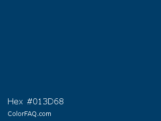 Hex #013d68 Color is a very dark blue color and the nearest color is Regal Blue #013f6a. Hex code #013d68 and RGB value is rgb(1,61,104). In RGB color space, this color is composed of 0% red, 24% green, 41% blue, In CMYK color space, this color is composed of 99% cyan, 41% magenta, 0% yellow , 59% black , In HSL color space, this color has a hue angle of 205° , 98% saturation and 21% lightness.